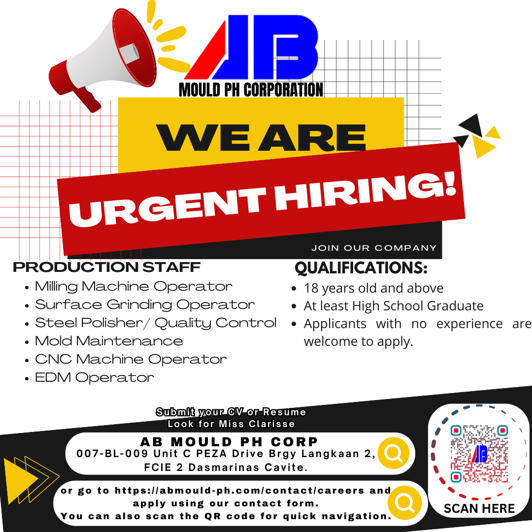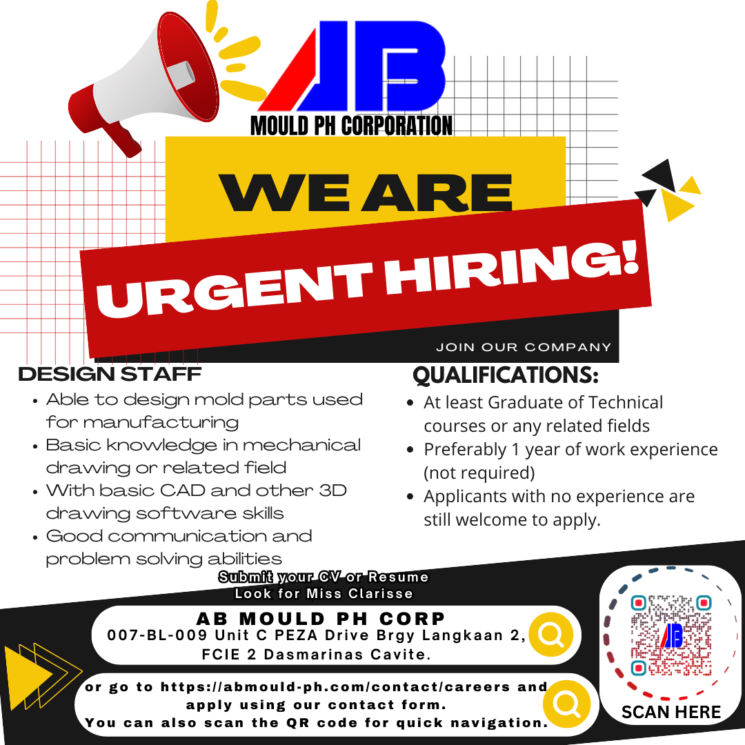 Any interested applicants can send their resumes to this link. Put in the subject line “AB Mould PH Corp. Application – <Your desired position>” before sending.